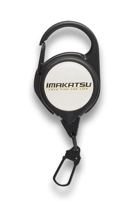 A pin-on reel with a carabiner with a cord length of 60 cm. The tip has a one-touch snap that allows you to easily set small items.