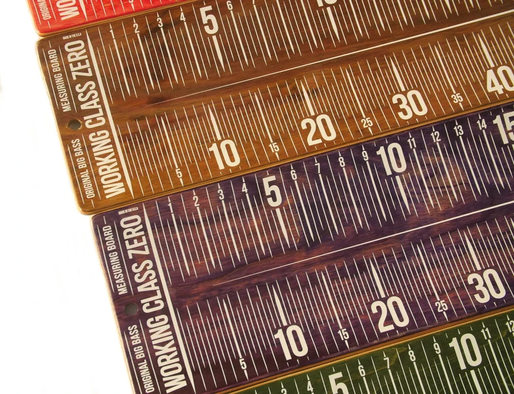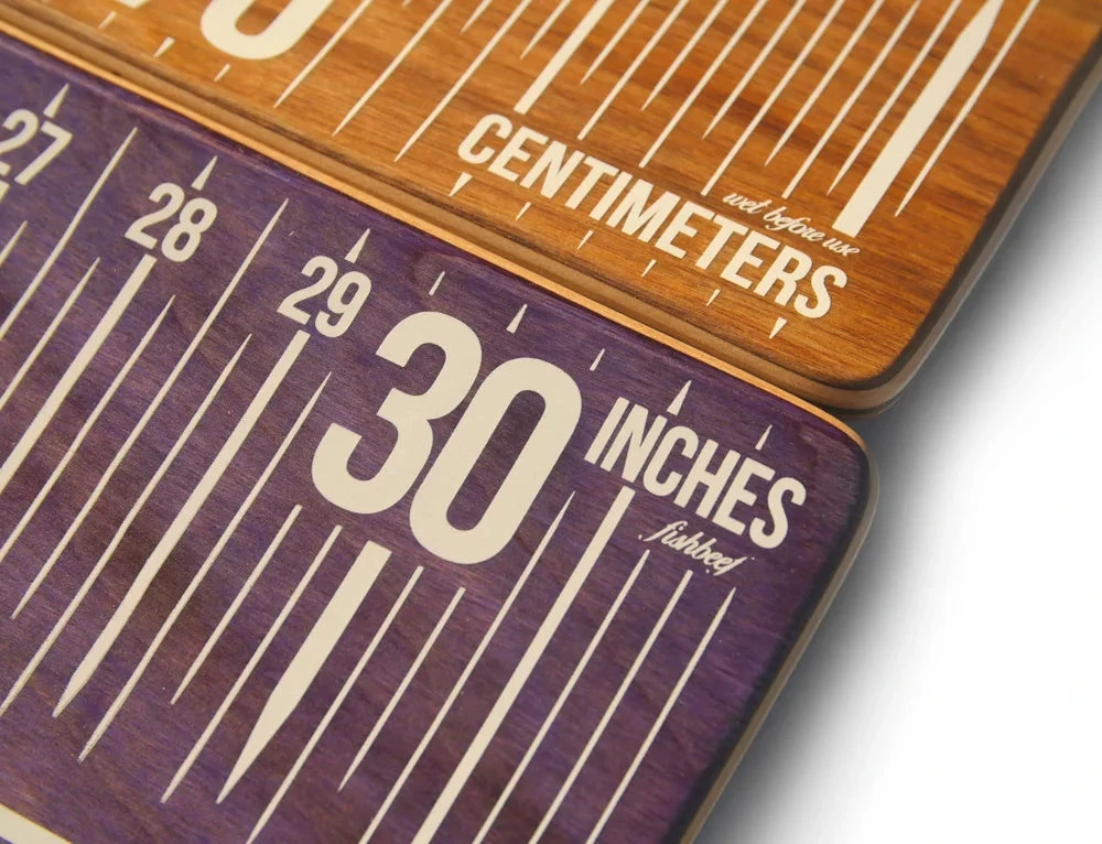 The Limited Edition Big Bass Measuring Board made up of 7 ply Canadian maple that is slow pressed in a custom mold creating concave to cradle those giant bass. Each board is individually shaped, printed and sealed with a water resistant coating to increase durability and life. Color of boards will vary from board to board because each board has a truly unique wood grain pattern and the dyes adhere to the grain differently per piece.