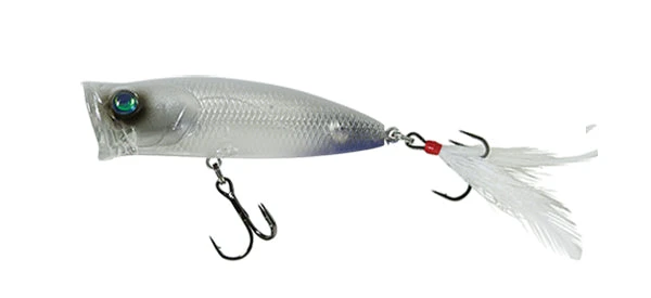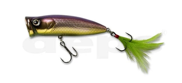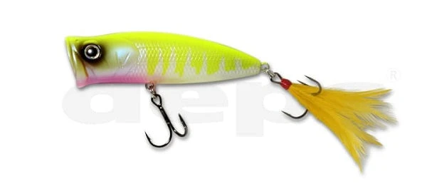 The Deps Pulse Cod is built with a spring weight micro vibe system- a weighted spring mounted inside the body that creates a high pitch “pulse” as the weight trembles in the currents, even when holding still. The flat cup shape of the mouth with bulges on the sides improves straightness and helps the bait float completely horizontal while still, and helps to create the popping splash as it pushes water when it moves across the surface.