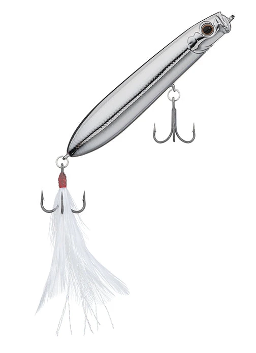 All the appeal of the Evergreen Shower Blows, now bite sized with the SB77.7. The unique bill produces powerful splatter, spit and bubbles that appeal to the fish. A body designed for air-resistance reduction, and tungsten weights at the very end of its tail guarantee incredible distance even against head winds. Excellent body balance allows it to make quick consecutive turns without jumping out of the water, making it move much like agitated bait fish chased by a bass. The feather hooks attached to the tail serve as “resonance” in the intervals between stillness and motion of an action, take those light bites of a fish unable to break above water into full-on bites, and help support the hook’s suction. On the other hand, the resistance created by the feather hooks has the effect of producing more sharpness to the bait’s quick turns.