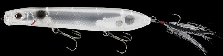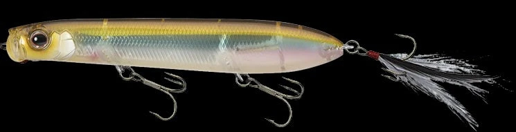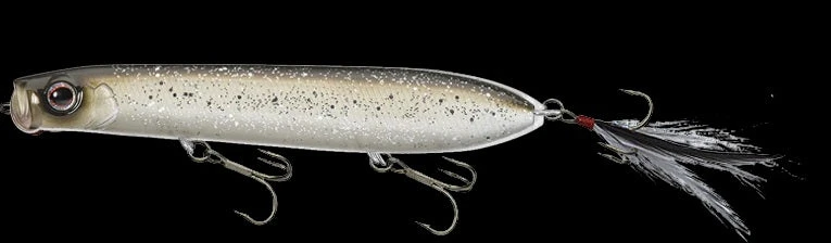 The Evergreen SB-105 and SB 125’s are in a league of their own. The unique bill produces powerful splatter, spit and bubbles that appeal to the fish. A body designed for air-resistance reduction, and tungsten weights at the very end of its tail guarantee incredible distance even against head winds. Excellent body balance allows it to make quick consecutive turns without jumping out of the water, making it move much like agitated bait fish chased by a bass. The feather hooks attached to the tail serve as “resonance” in the intervals between stillness and motion of an action, take those light bites of a fish unable to break above water into full-on bites, and help support the hook’s suction. On the other hand, the resistance created by the feather hooks has the effect of producing more sharpness to the bait’s quick turns.