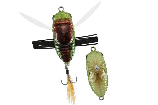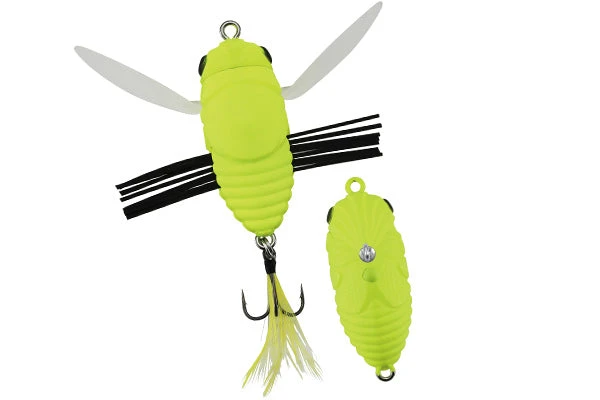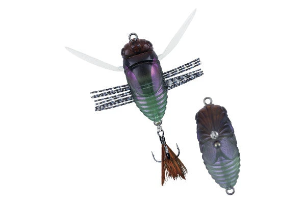 This “Bug” lure will induce bites with its silhouette and pulsation affect. The Realis Shinmushi has incorporated the actions of a “hard” body and “soft” rubber legs, creating a 3 dimensional pulsation the bass fancy. The most important factor for the “Bug” lure is the “sound” the bug makes when falling on the surface of the water. The hard body of the Shinmushi will enable any angler to create this effect. In addition, the rubber legs and feather on the tail hook will also induce bites from the bass. The wings works as a “stopper”, limiting the lure from traveling too far, while staging a “freestyle” swimming action when retrieving. Anglers will be able to approach the fish in a versatile manner. This ultimate “bug” lure will automatically induce bites from the bass while “stopping” it or “moving” it.