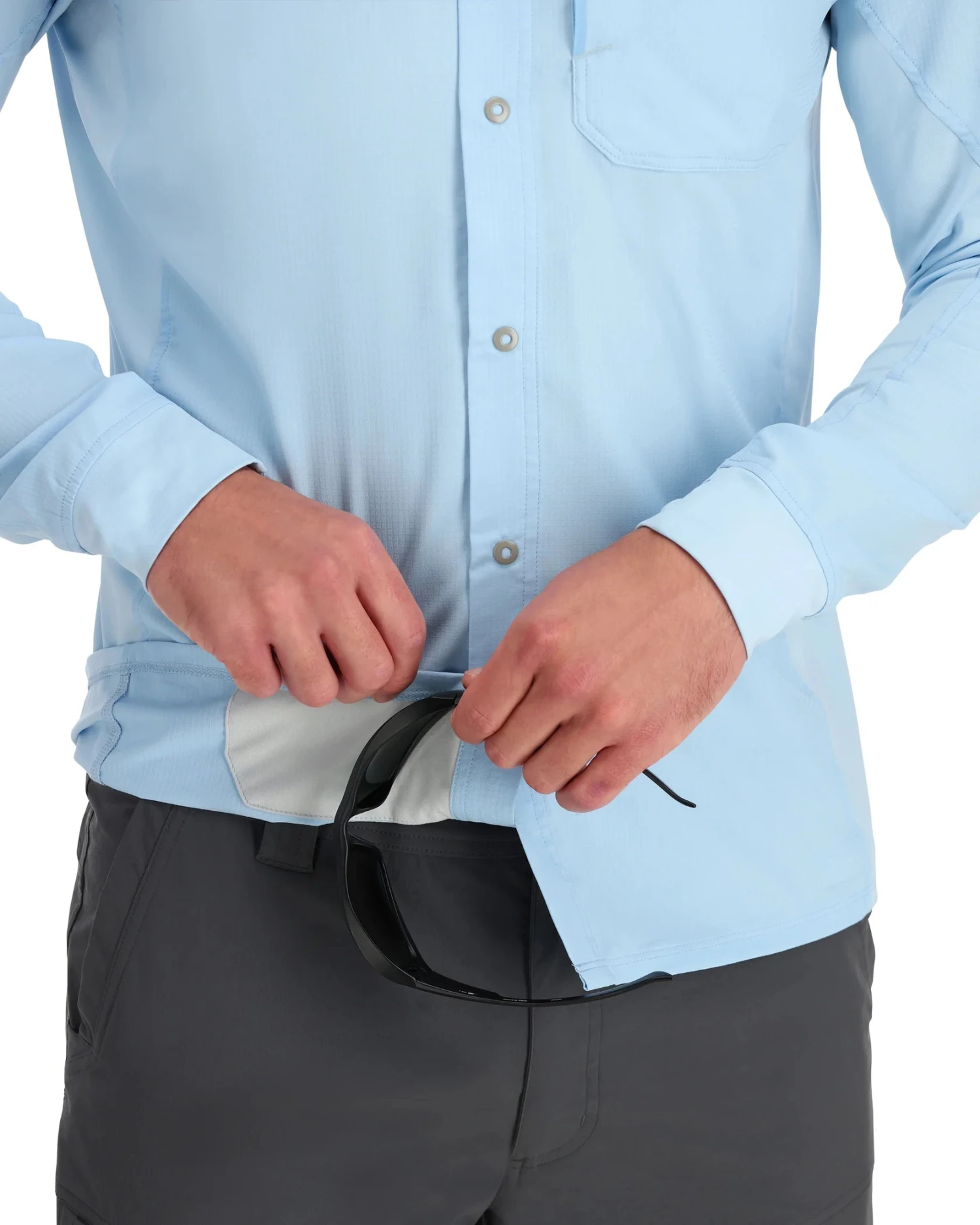 - Zippered left-chest pocket for on-water essentials and convenient sunglasses chamois